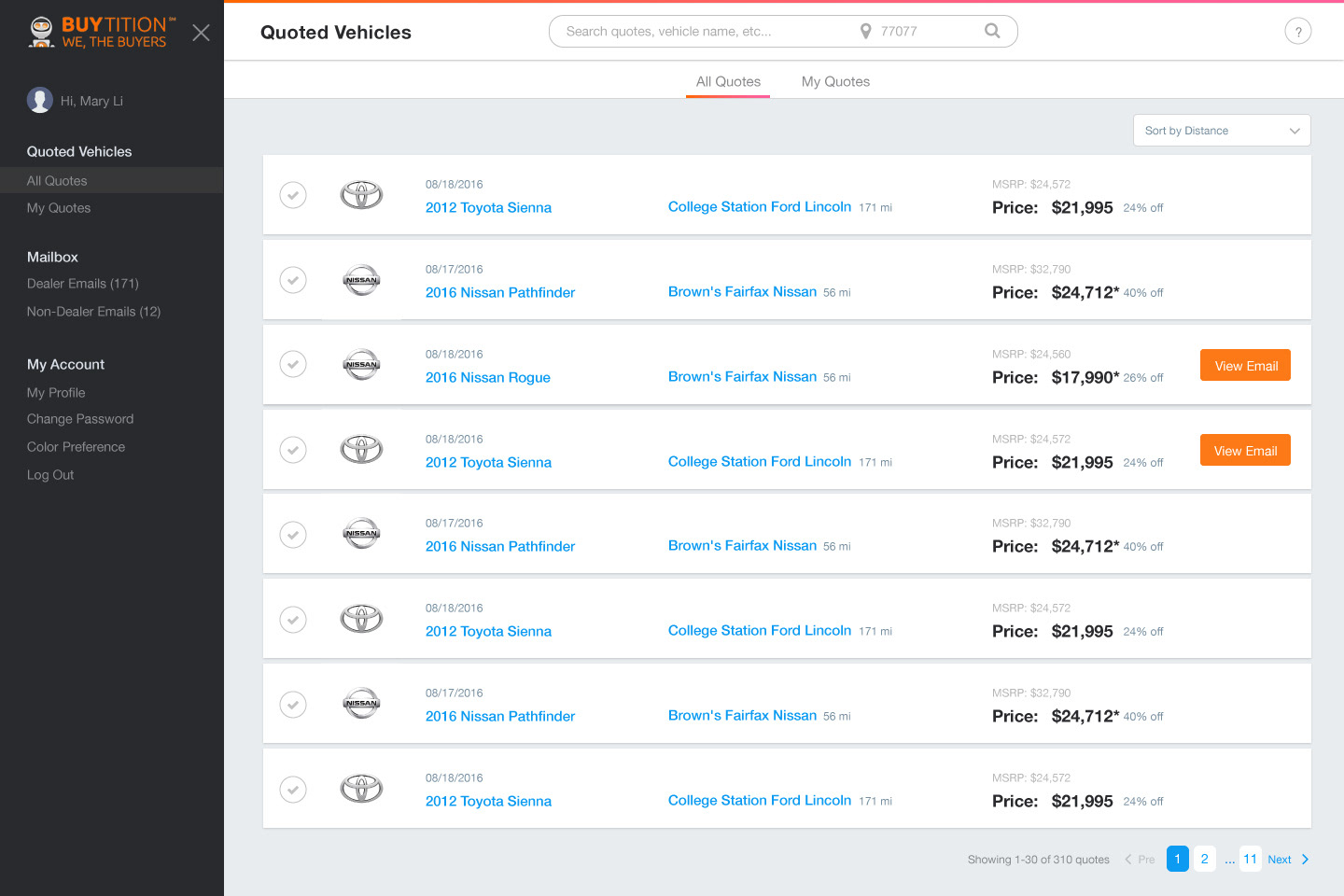 Buytition reads and filters out quotes data automatically from dealer's emails. Users can easily compare prices on All Quotes page.