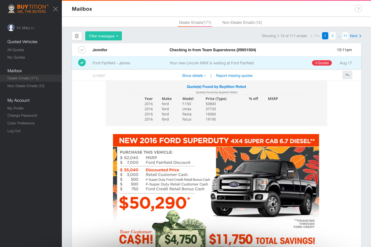 Buytition will keep email history in Mailbox. When reading email, it will show price comparison from other dealers.